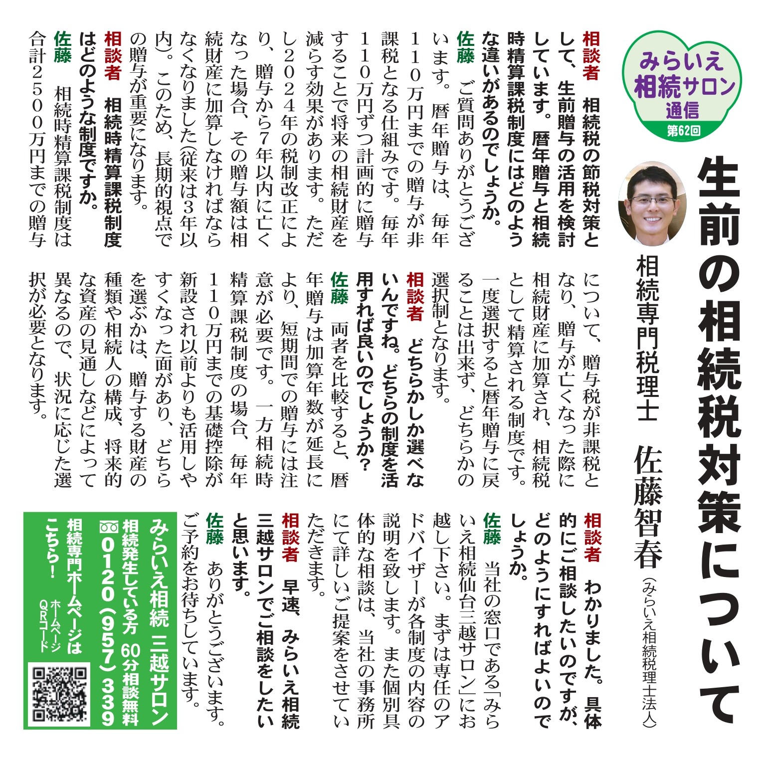 佐藤:両者を比較すると、暦年贈与は加算年数が延長により、短期間での贈与には注意が必要です。一方相続時精算課税制度の場合、毎年110万円までの基礎控除が新設され以前よりも活用しやすくなった面があり、どちらを選ぶかは、贈与する財産の種類や相続人の構成、将来的な資産の見通しなどによって異なるので、状況に応じた選択が必要となります。