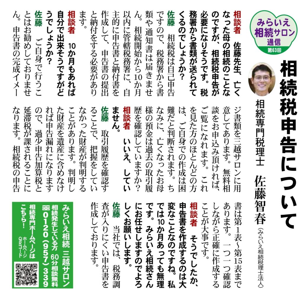 佐藤:ご自身で行うことはお勧めしておりません。申告書の完成イメージ書類を三越サロンに用意してあります。無料相談をお申込み頂ければ、ご覧になれます。これを見た方のほとんどの方は、ご自身での作成は困難だと判断されます。ちなみに、亡くなったお母様の預金は過去の取引履歴を確認していますか?