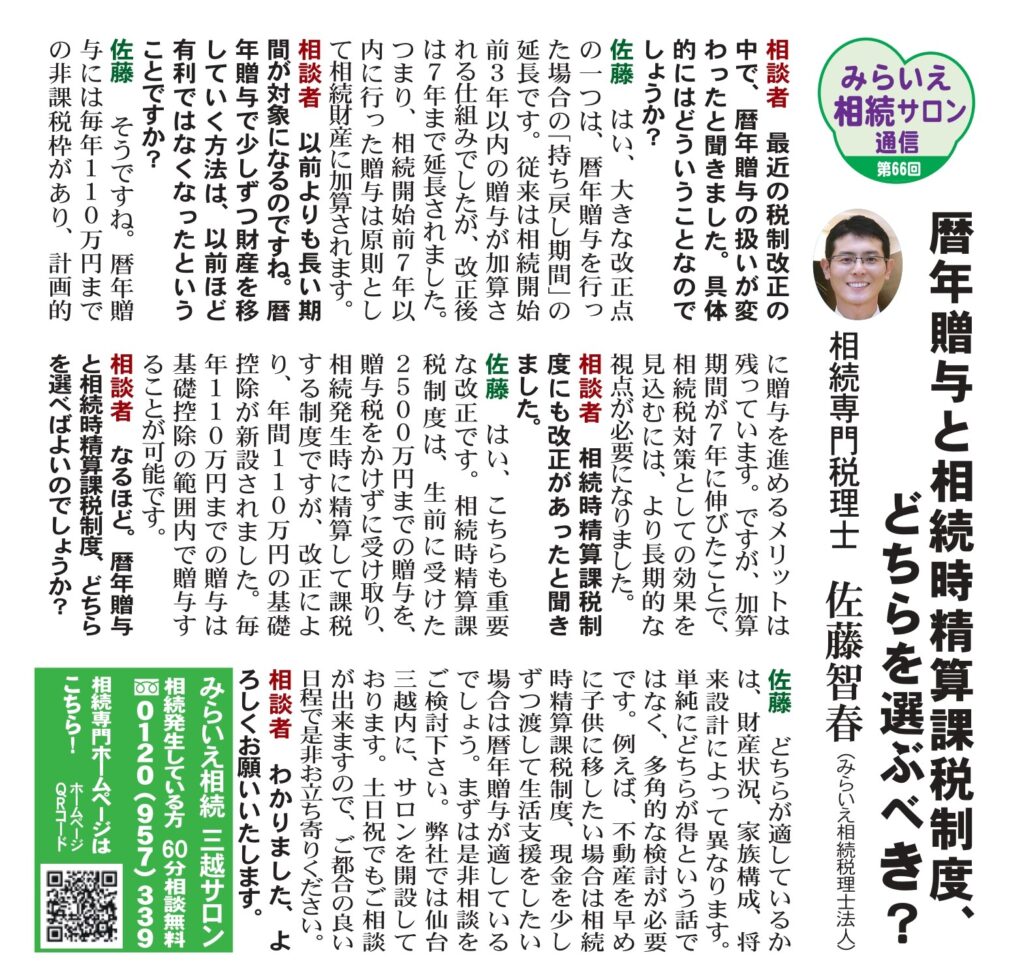 佐藤:どちらが適しているかは、財産状況、家族構成、将来設計によって異なります。単純にどちらが得という話ではなく、多角的な検討が必要です。例えば、不動産を早めに子供に移したい場合は相続時精算課税制度、現金を少しずつ渡して生活支援をしたい場合は暦年贈与が適しているでしょう。まずは是非相談をご検討下さい。弊社では仙台三越内に、サロンを開設しております。土日祝でもご相談が出来ますので、ご都合の良い日程で是非お立ち寄りください。