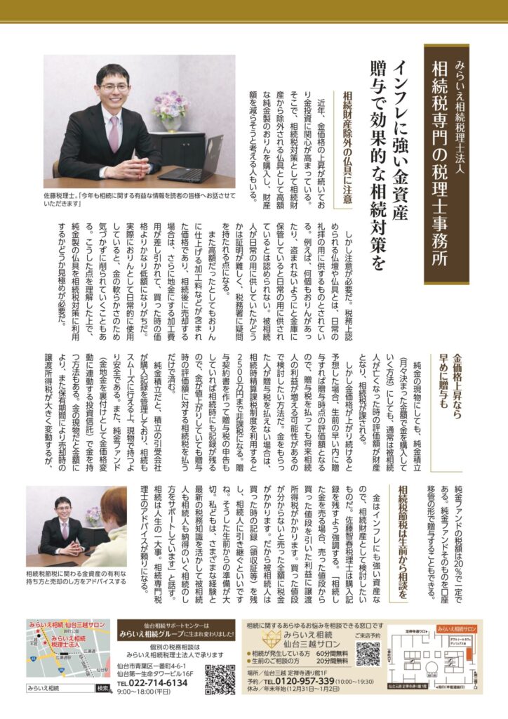 金はインフレにも強い資産なので、相続財産として検討したいものだ。佐藤智春税理士は購入記録を残すよう強調する。「相続した金を売る場合、売った値段から買った値段を引いた利益に譲渡所得税がかかります。買った値段が分からないと売った全額に税金がかかります。だから被相続人は買った時の記録(領収証等)を残し、相続人に引き継ぐといいですね。そうした生前からの準備が大切。私どもは、さまざまな経験と最新の税務知識を活かして被相続人も相続人も納得のいく相続のし方をサポートしています」と話す。相続は人生の一大事。相続専門税理士のアドバイスが頼りになる。